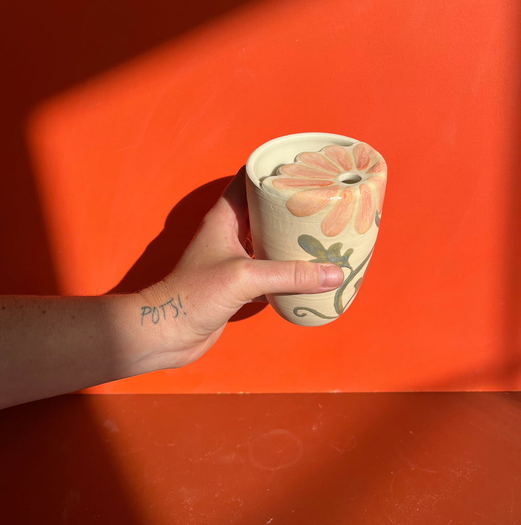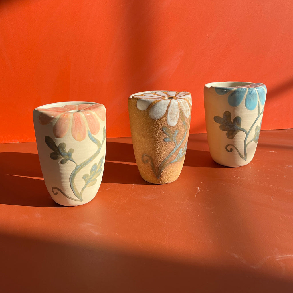 Floral stoneware sippy cups with a petal-scalloped sippy top. Circular hole that fits a straw or allows for sipping from. They even come with a straw! These comfortably hold ~12 ounces. Options for a brown clay with white flower or a white clay with pink flower or a white clay with blue flower.